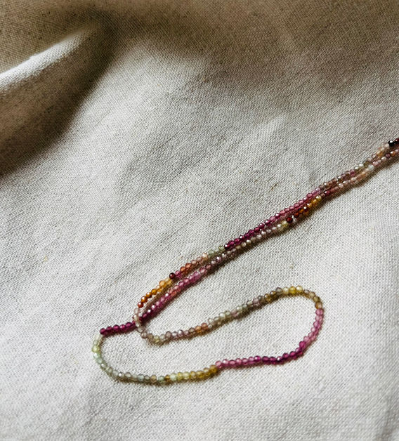 Multi-coloured faccetted 2mm sapphire beads strung on pearl silk with a 9ct yellow gold clasp.